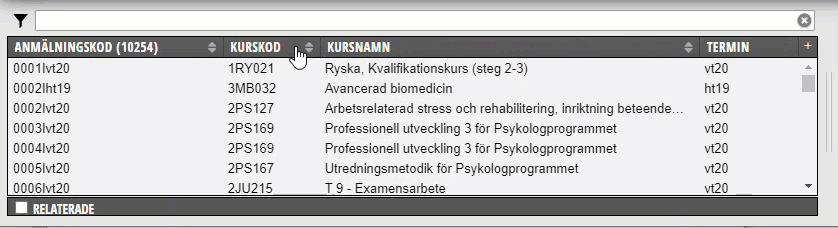 Vill du justera bredden på en kolumn ställer du muspekaren mellan två kolumnrubriker. Pekaren ändras till en höger/vänster-pil. Klicka dra och släpp för att justera bredden.