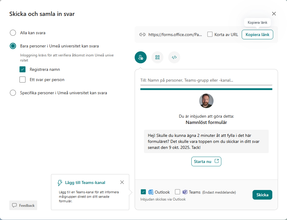 Ja, du kan dela ditt formulär med vem du vill. För att detta ska vara möjligt måste du ställa in formuläret genom att gå till inställningar och välja Alla kan svara.