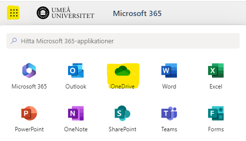 Utöver filerna i OneDrive appen bör ni även kontrollera era filer i molnet. För att göra det går ni till https://m365.umu.se loggar in, klickar på OneDrive och sen Mina Filer.