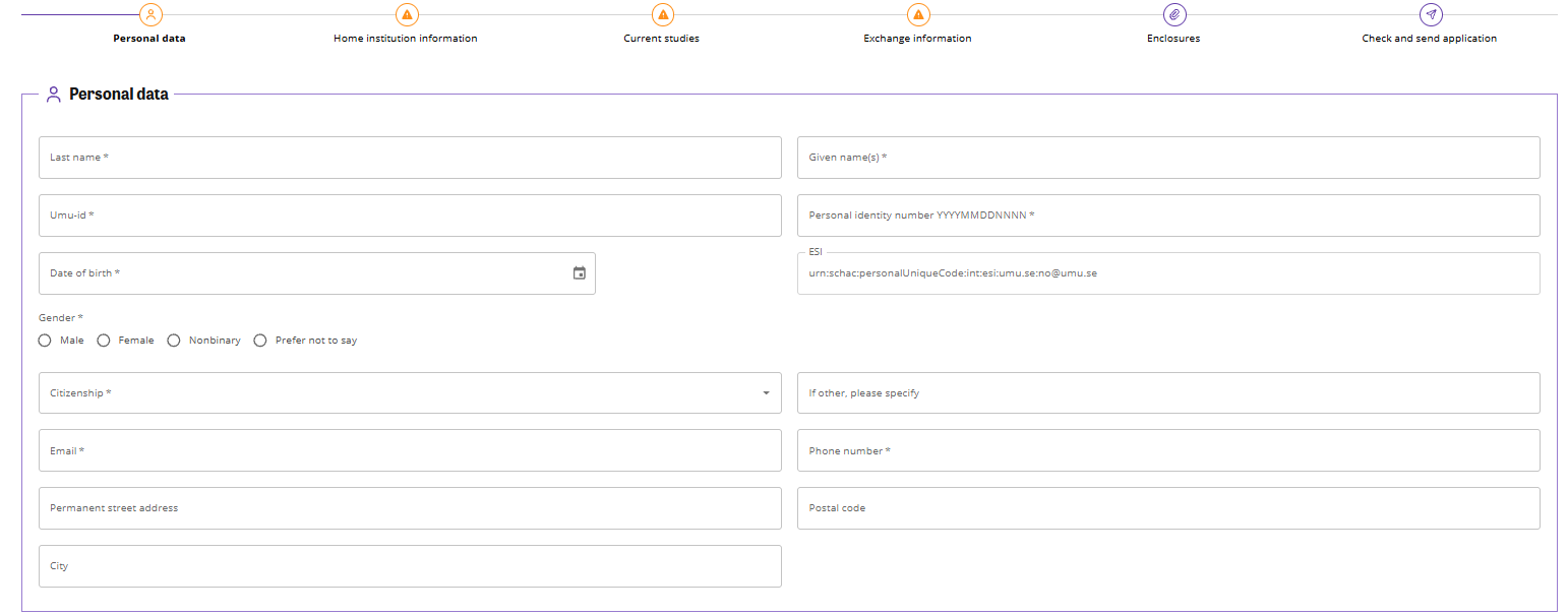 For Erasmus exchange students: If your application is for an exchange within the Erasmus programme, some of the information you add under Personal data and Current studies in your application will be transferred to your Online Learning Agreement. It is therefore important that you fill in this information correctly, as it can be difficult to change it afterwards.