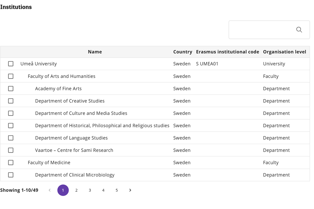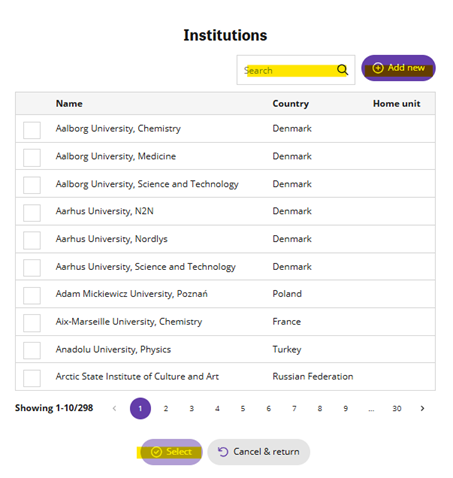 ‘Name of your home department’ Fill in your home institution by ticking the box next to the correct department or type the name in the search field and click ’Select’