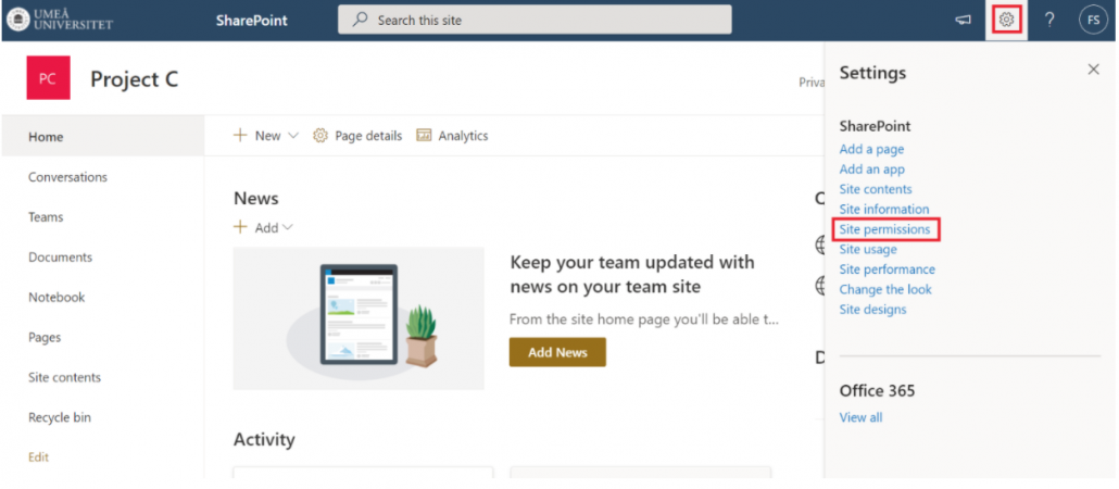 - Go to the homepage of the SharePoint site and select the settings icon in the upper right corner. Then select Site permission.