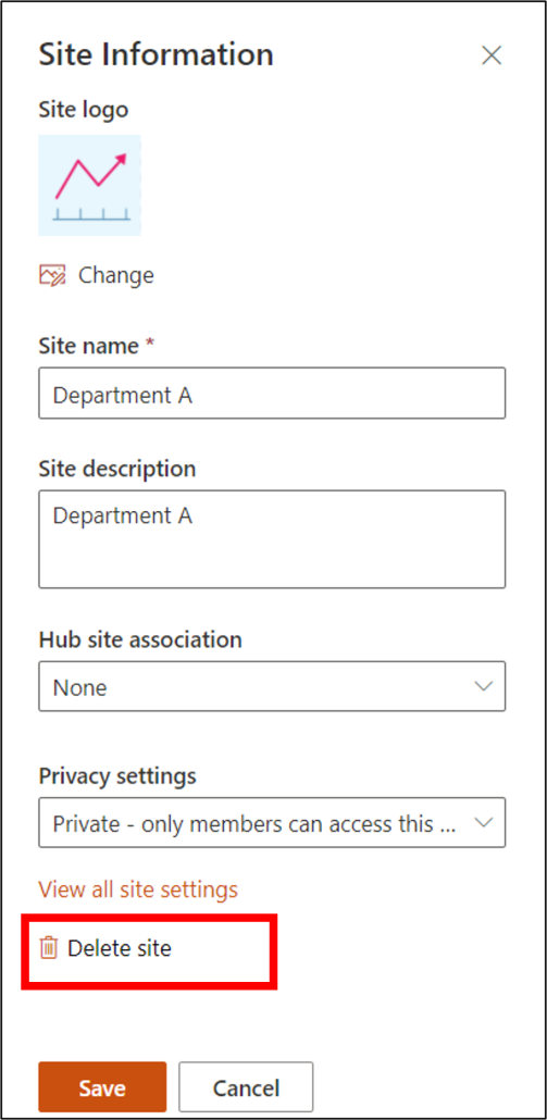 - A dialog box on the right appears. Select Delete Site.
