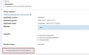 This manual describes how you change your application for study support in Ladok for students. In order to change your application, the registration period for the exam must still be open.