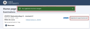 - You will receive confirmation that your application has been changed and will also see that the status of the examination is “Application for support has been sent.” Once the department have processed your application, you will be notified of the outcome via Ladok for students. You will receive a notification (email) when there is new information about your application in Ladok for students.