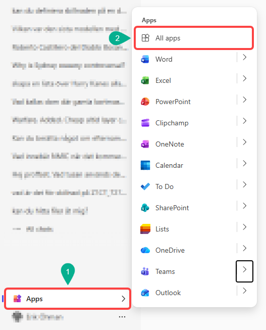 Once logged in to the Microsoft 365 portal, first click on Apps and then All apps