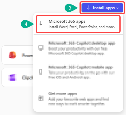 Click Install apps 3️⃣ in the top right corner and click Microsoft 365 apps 4️⃣.