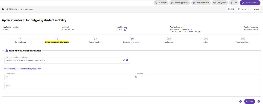 I fliken ’Home institution information’ ser du den valda institutionens namn och den ansvarige kontaktpersonens uppgifter. Kom ihåg att alltid klicka ’Save’ om du ändrar något i ansökan.