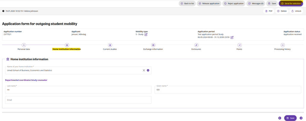 Du kan redigera data i studentens ansökan även efter att ett beslut är taget. Även ’Mobility type’ och ’Application period’ kan redigeras. Kom ihåg att klicka ’Save’ så fort du gjort ändringar.