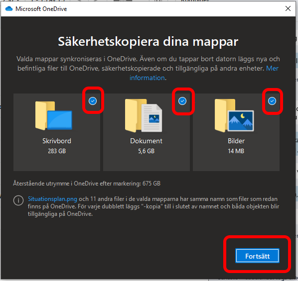 Vill du inte att mapparna ska synkas upp i molnet väljer du att bocka ur dessa. Klicka sedan på Fortsätt.