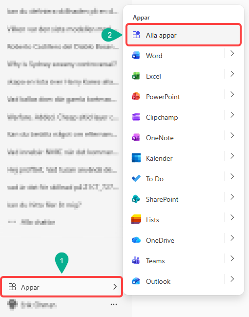 Väl inloggad på Microsoft 365-portalen klickar du först på Appar 1️⃣ och sedan Alla appar 2️⃣ längst ner till vänster på sidan.