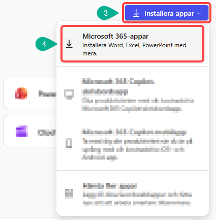 Klicka på Installera appar 3️⃣ uppe i det högra hörnet och på Microsoft 365-appar 4️⃣.