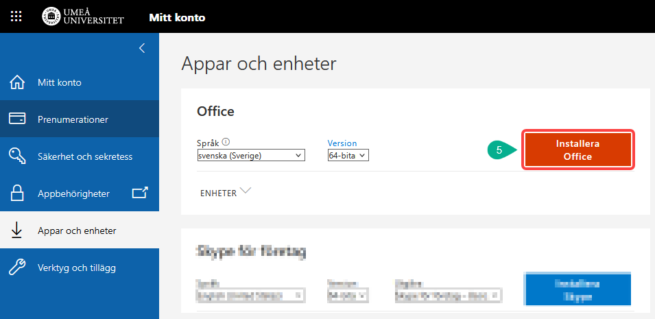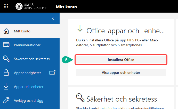 Beroende på hur webbläsaren tolkar länken kan två olika vyer öppnas men oavsett utseende ska du nu klicka på Installera Office 5️⃣.
