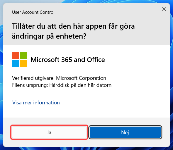 Öppna filen OfficeSetup.exe och godkänn att appen får köras om du får frågan (rutan som visas kan se lite annorlunda ut men syftet och tillvägagångssättet är detsamma).