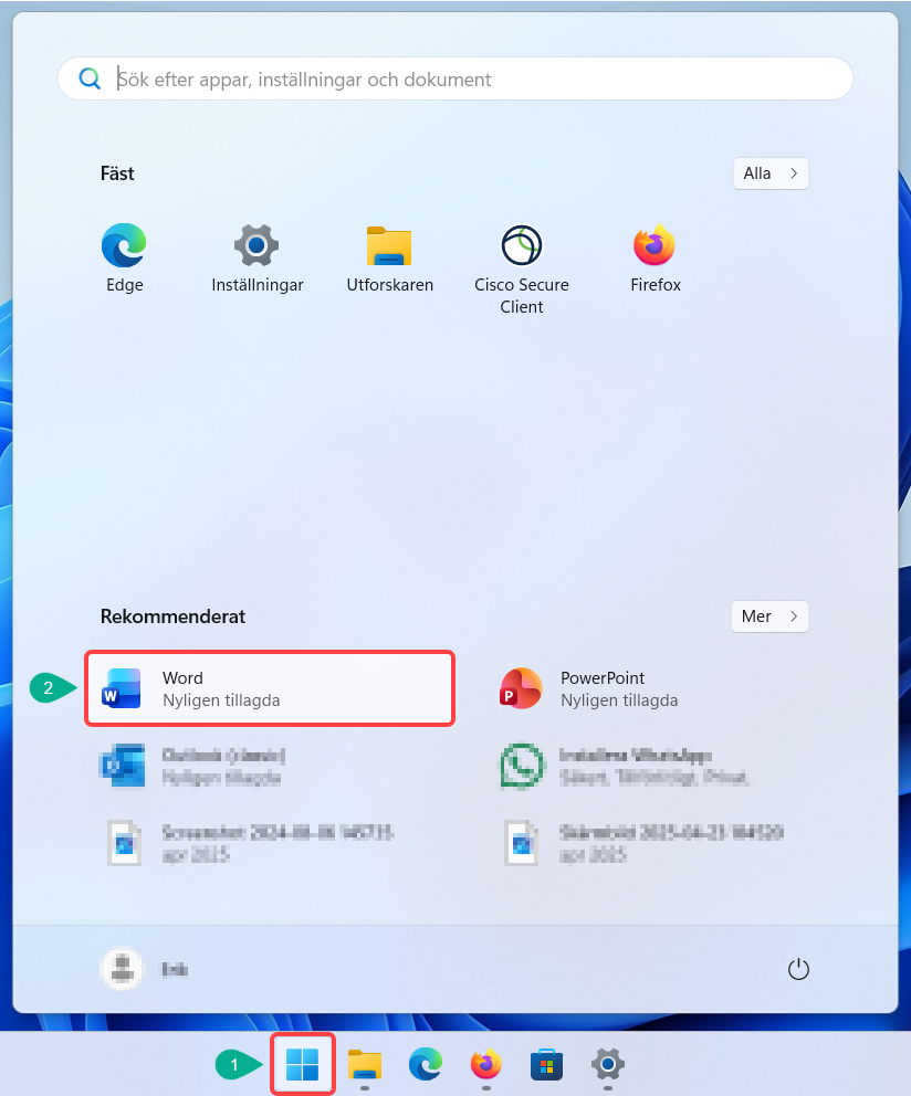 Klicka först på Start-menyn 1️⃣ och välj sedan exempelvis Word 2️⃣.