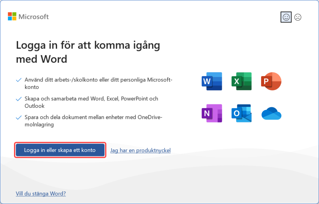 Första gången du öppnar en Office-app kommer denna ruta upp.