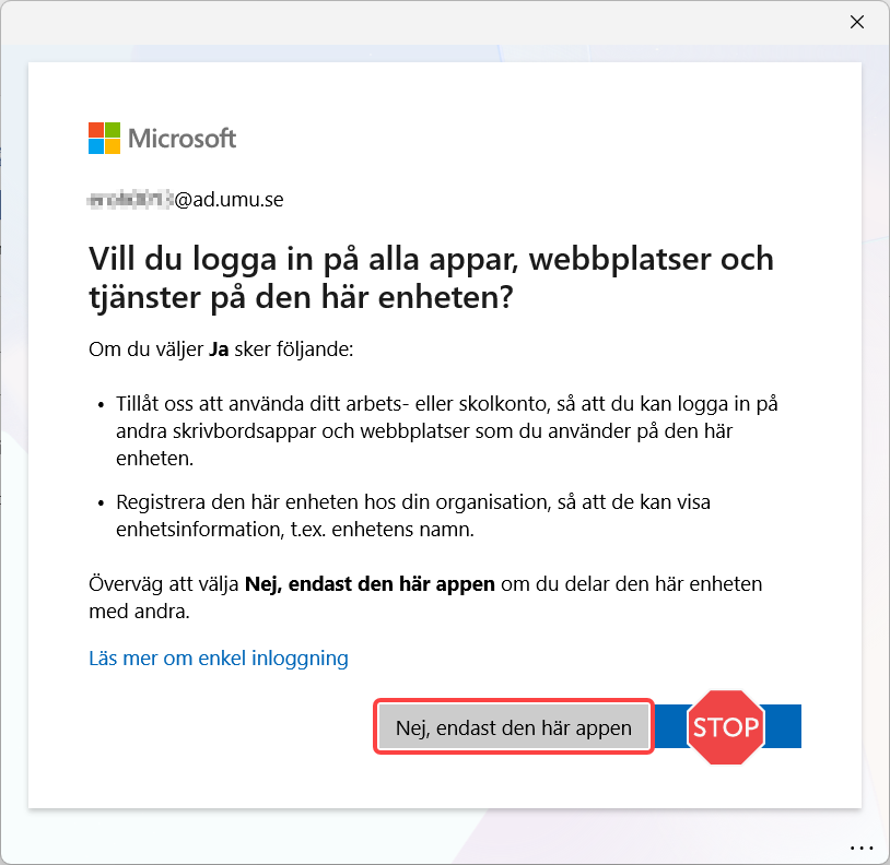 När du ser denna ruta är det rekommenderat att klickar på Nej, endast den här appen.