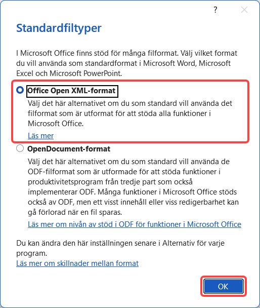 Rekommendationen är att välja Office Open XML-format för bredaste kompatibiliteten.