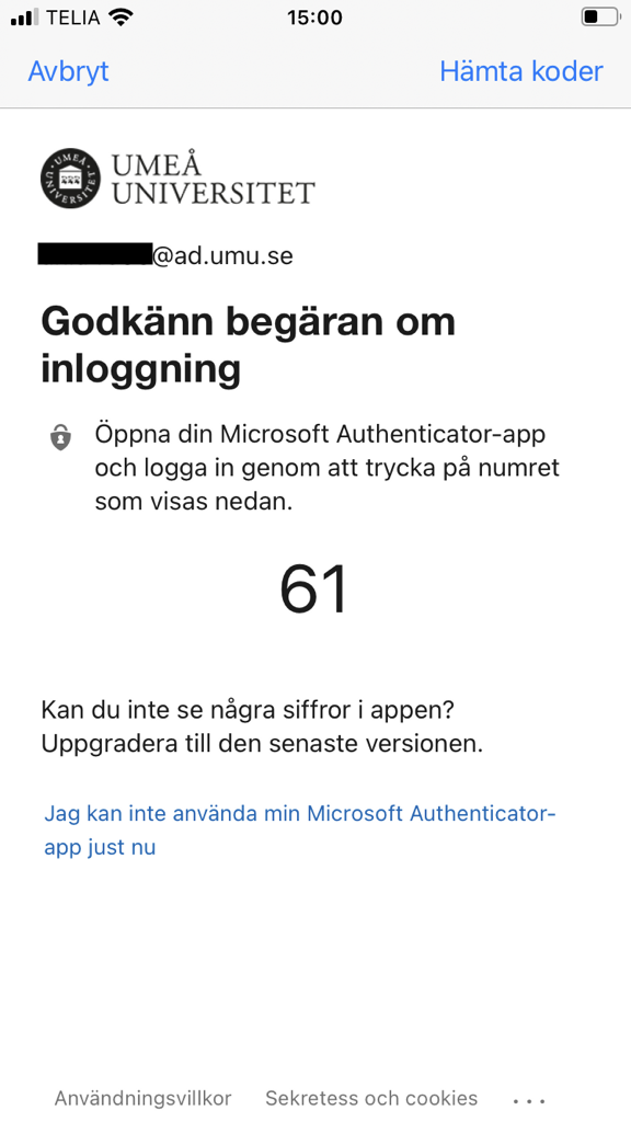 Multifaktorautentisering (MFA) är en tjänst som ger dig ett utökat skydd vid inloggning. Tjänsten innebär att när du loggar in i vissa tjänster vid universitet kommer du att använda appen Microsoft Authenticator på din telefon/surfplatta eller med hjälp av en dosa, utöver ditt Umu-id och lösenord. I denna guide beskriver vi hur du loggar in med multifaktorautentisering mot Microsoft 365 vid Umeå universitet med hjälp av en mobil enhet eller en dosa.