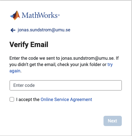 • Du kommer få ett bekräftelsemejl från Mathworks som skickas till din student-e-post. Det är vanligt att bekräftelsemejlet hamnar i skräpkorgen.