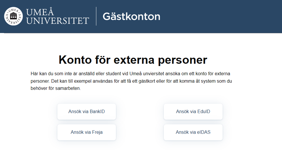 Du kan ansöka om ett gästkonto vid Umeå universitet och bli tilldelad ett UMU-id med hjälp av e-legitimation.