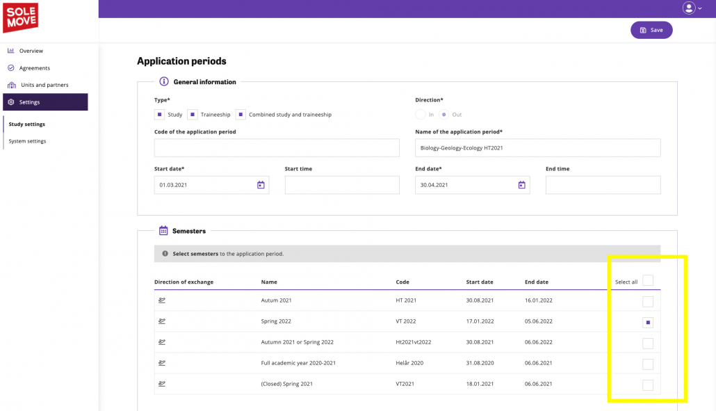 Klicka på ’Settings’ och ’study settings’. I menyn som dyker upp i överkant på sidan ska du sedan välja ’Application periods’.