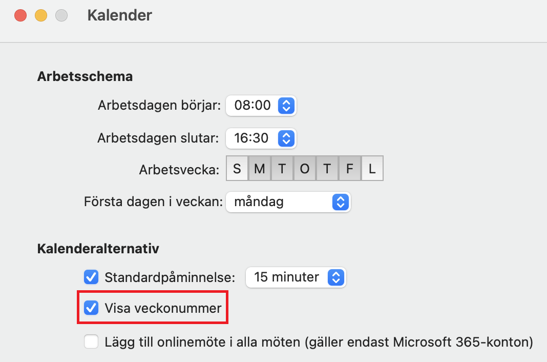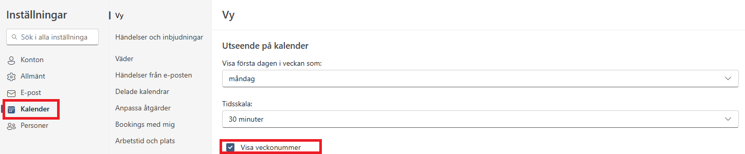 - Välj kalender i menyn till vänster och klick i Visa veckonummer bland alternativen